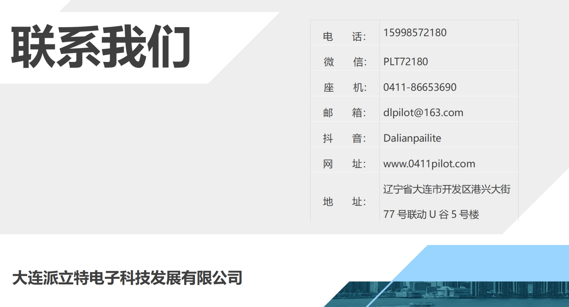 工廠:遼寧省大連市開發區海青街道聯東U谷77-5號  公司:大連派立特電子科技發展有限公司